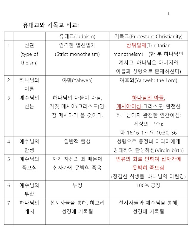 1. Christianity vs Judaism (유대교): (This comparison is in this page: 이 비교표는 이 페이지 안에 있슴):